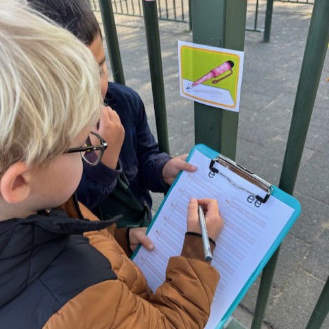 Om de letters E en EE te oefenen, is er een eenvoudige buitenles ontworpen. De leerlingen werken bij dit spel in tweetallen. Ieder tweetal krijgt een invulblad waarop zij de woorden op moeten schrijven. De 14 plaatjes worden uitgeknipt en vervolgens verspreid opgehangen. Ieder tweetal loopt naar een plaatje en schrijft het bijpassende woord in de goede rij op.