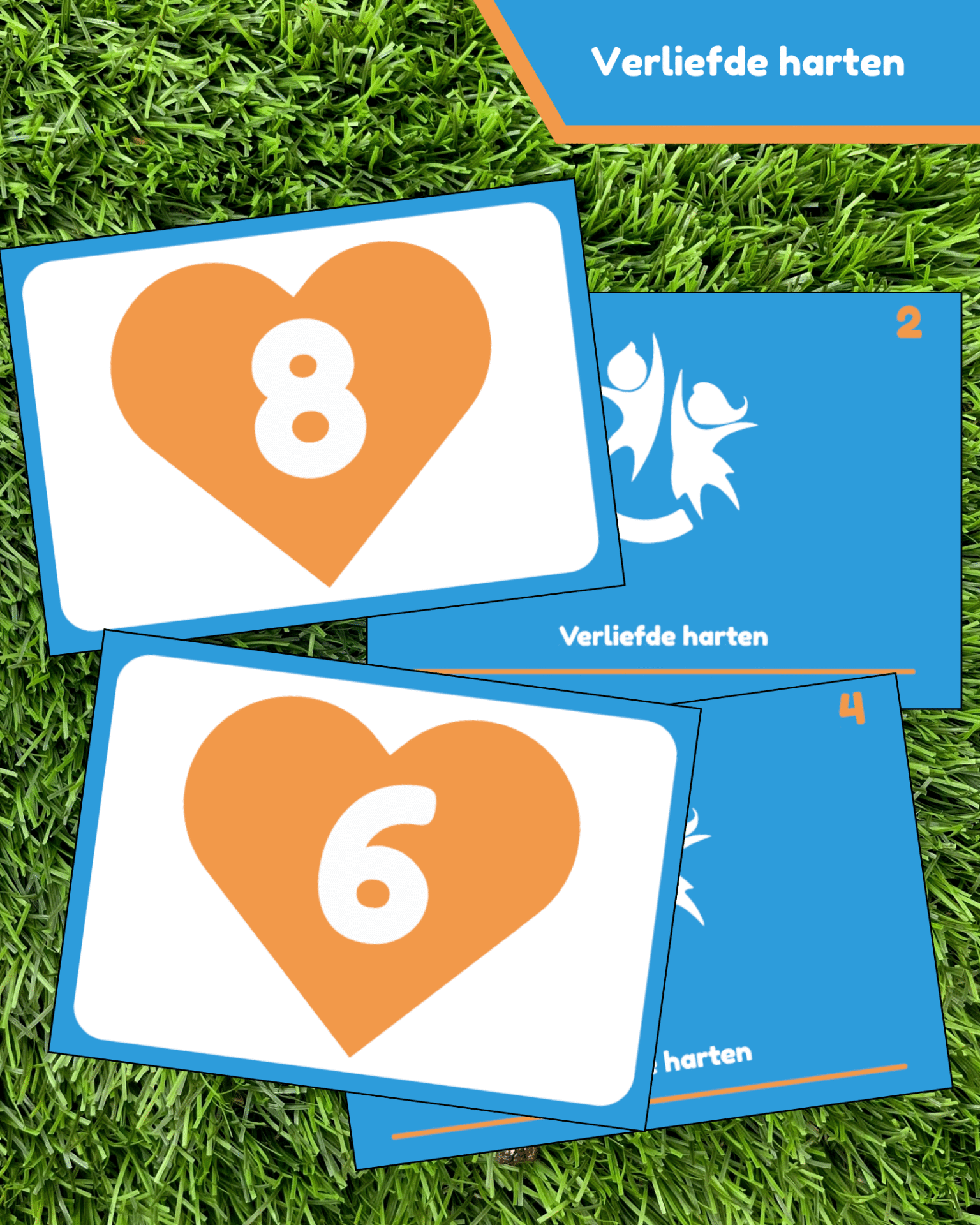 Verliefde harten is een Beweegspel waarbij leerlingen van groep 3 (en begin 4) oefenen met de verliefde harten, dat zijn getallen die ‘samen 10’ zijn.